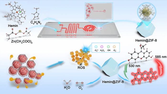 图1 用于细胞ROS传感的Hemin@ZIF-8微流体合成示意图