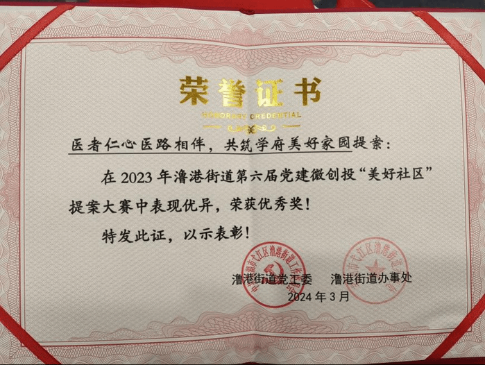 为进一步发挥支部党员先锋模范作用,倾心服务群众、奉献社会,公司党委员工第三党支部“青禾”志愿服务队积极响应“老员工进社区”行动号召,2023年《医者仁心医路相伴 共筑学府美好家园》提案申报澛港街道第六届党建微创投“美好社区”提案大赛并立项。3月底,“青禾”志愿服务队在开展一年社区服务后,活动成效深得社区和居民认可,获得澛港街道第六届“美好社区”提案大赛优秀提案。