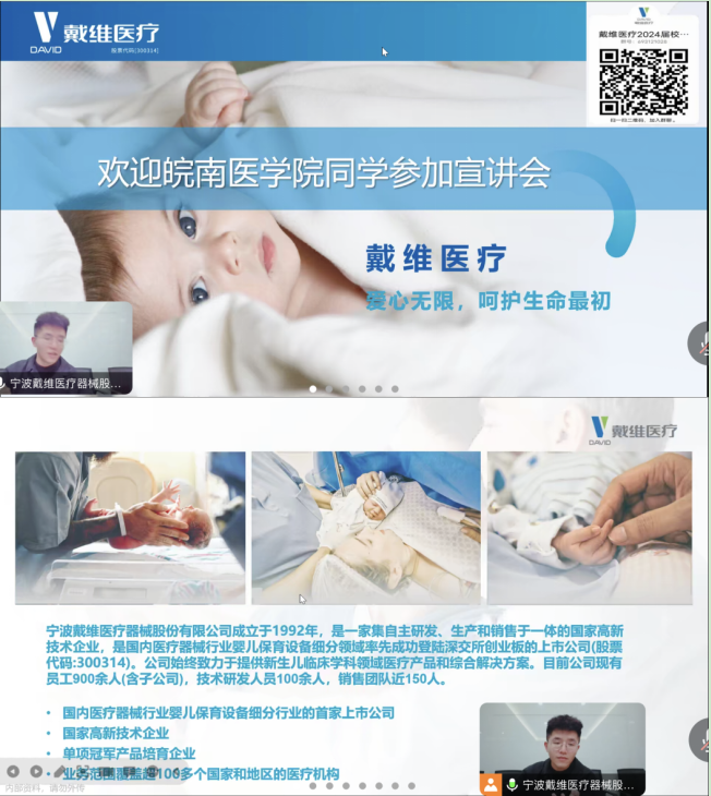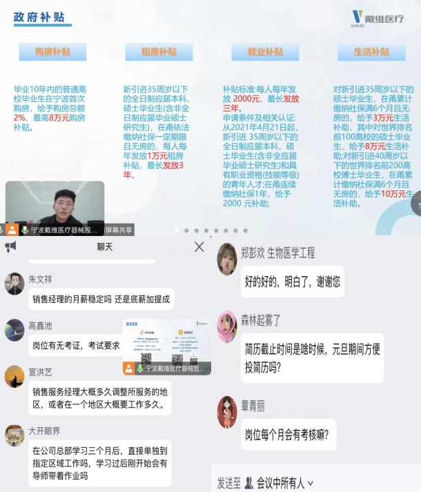 为推进毕业生就业工作,贯彻落实服务育人理念,全力推进毕业生充分、高质量就业。12月29日晚,beet365联合宁波戴维医疗有限公司开展专场线上招聘会,公司党委副书记黄侃、宁波戴维医疗有限公司人力资源部俞浩杰、毕业班辅导员李宁和2024届生物医学工程专业毕业生参加会议。
