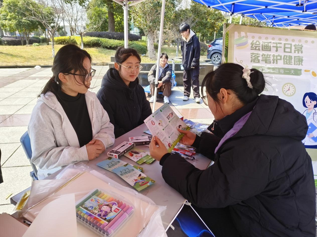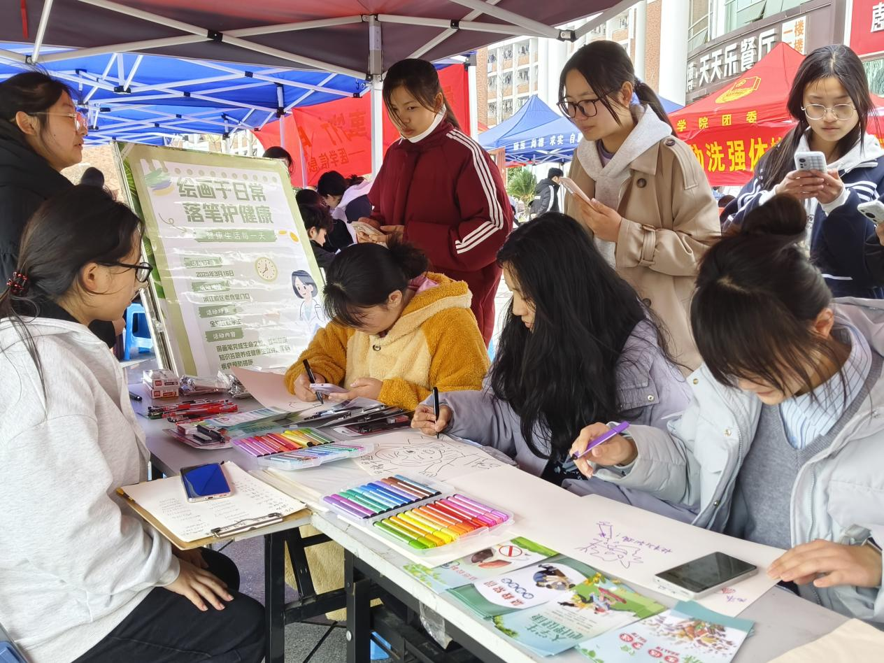 草木蔓发,春山可望。为迎接第62个学雷锋纪念日,近日,beet365团委、员工会联合员工第二党支部开展了雷锋月“我为同学做实事”系列项目之“绘形于日常,落笔护健康”主题活动。活动在滨江校区北区食堂门口展位处开展,旨在向同学们普及健康知识,培养健康作息习惯。