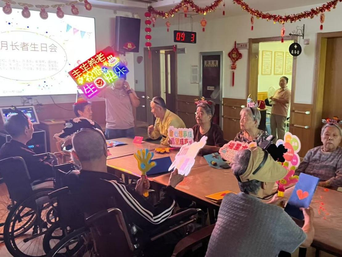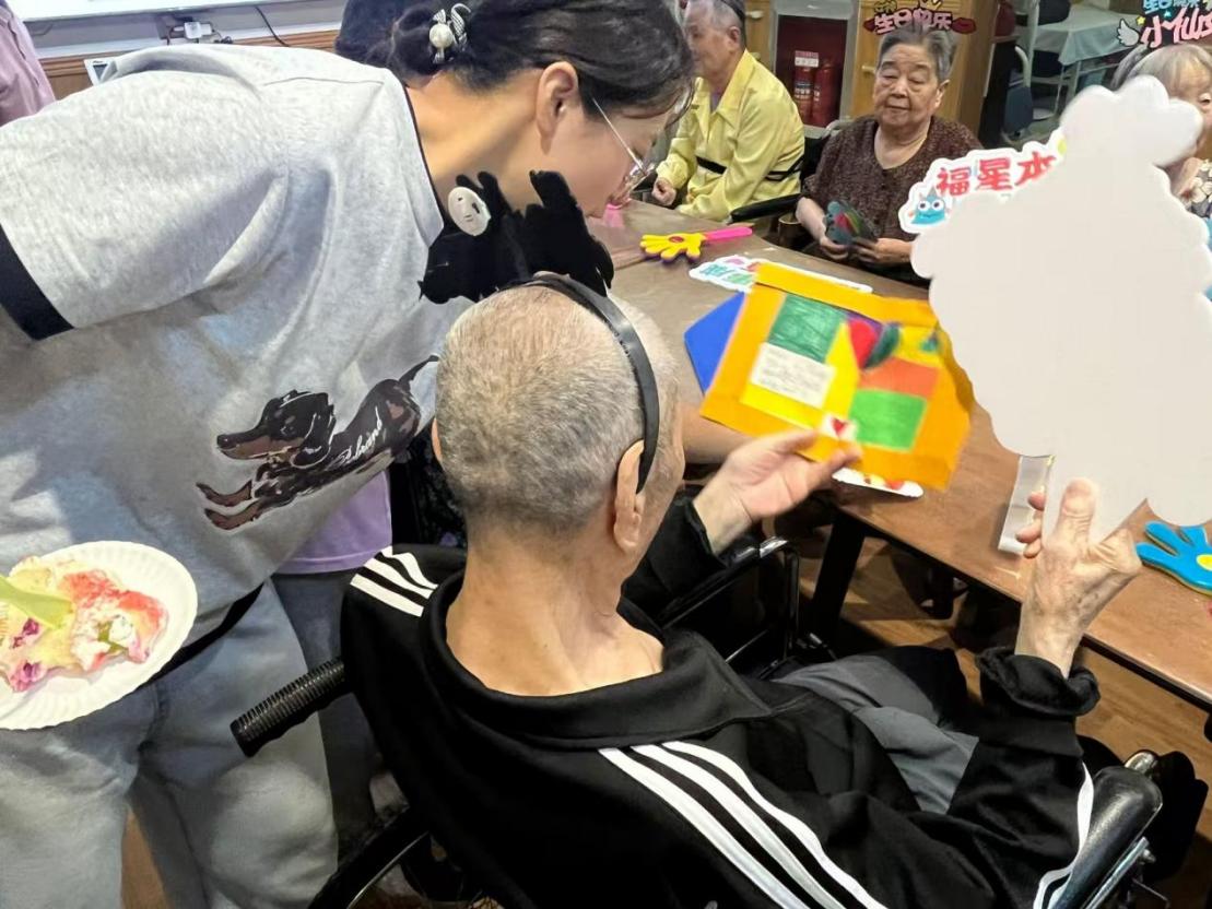 当烛火映亮满室笑颜,分切的蛋糕将生日会的温情悄然推向了最暖的高潮。志愿者们小心翼翼地将蛋糕分切成小块,细心地递到每位老人手中,他们耐心倾听老人们讲述过去的故事,时不时递上纸巾、整理衣角,一举一动满是关怀。老人们在志愿者的暖心陪伴下,脸上始终洋溢着开心的笑容。活动接近尾声,老人们脸上的笑意未减,握着志愿者的手再三道谢。合影时,满是皱纹的笑脸与年轻的面庞相映,定格下这份双向奔赴的温暖,也印证着活动传递的关爱与欢乐。