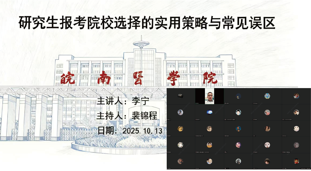 为进一步指导2026届医学影像学专业员工考研报考意向,帮助同学们科学规划升学路径,提高考研升学率,beet365于10月13日晚,开展 以“研究生报考院校选择的实用策略与常见误区” 为题的线上指导讲座。活动由2021年级辅导员裴锦程主持,特邀2025级辅导员李宁老师主讲,全体2026届医学影像学专业考研报名同学参加。