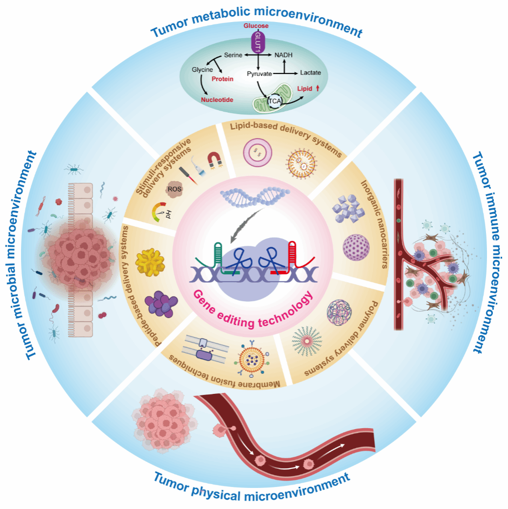 利用纳米材料结合基因编辑技术调控肿瘤的代谢、免疫、微生物和物理微环境,是一种极具前景的肿瘤治疗新策略