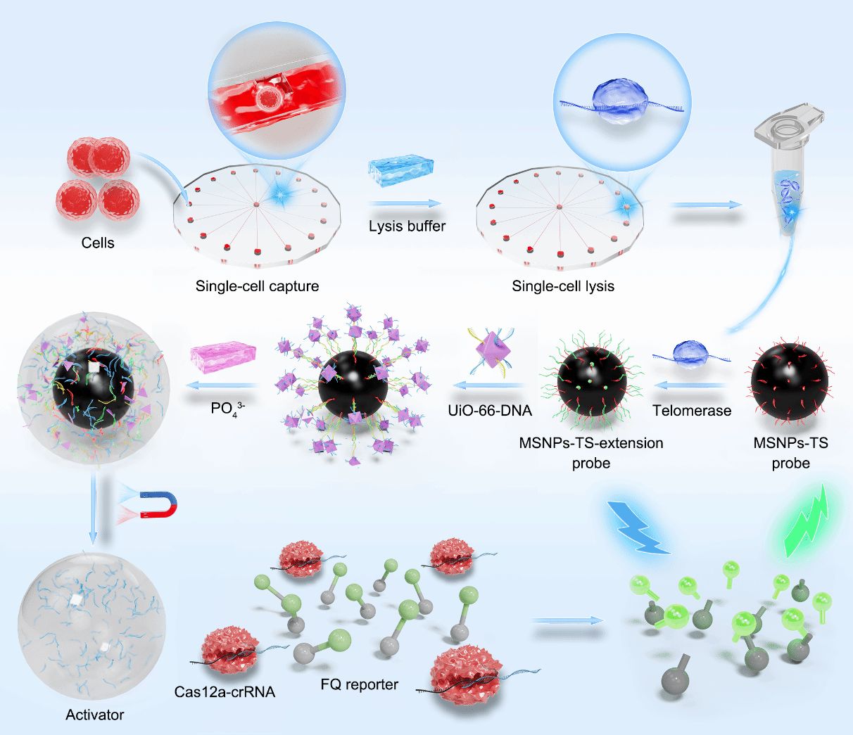 该研究通过将DNA功能化的UiO-66纳米粒子作为信号转导体,利用微流控芯片实现了单细胞的捕获与端粒酶的提取,并通过CRISPR-Cas12a的反式切割活性生成荧光信号,最终实现了对端粒酶活性的高效检测。该平台的双重放大机制显著提升了检测的灵敏度和特异性,相较于传统的端粒酶检测方法,该方法具备时间短、灵敏度高的显著优势,并成功应用于多种癌细胞中,展示了其在临床癌症诊断中的广泛应用潜力。(高彦峰/文、图)