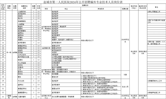 本次公开招聘相关信息在盐城市卫生健康委员会网站(https://wsj.yancheng.gov.cn/)及盐城市第一人民医院网站(http://www.ycsyy.com/)上发布,具体招聘岗位、数量、资格条件等详见《盐城市第一人民医院2024年公开招聘编外专业技术人员岗位表》(附件1,以下简称《招聘岗位表》)。