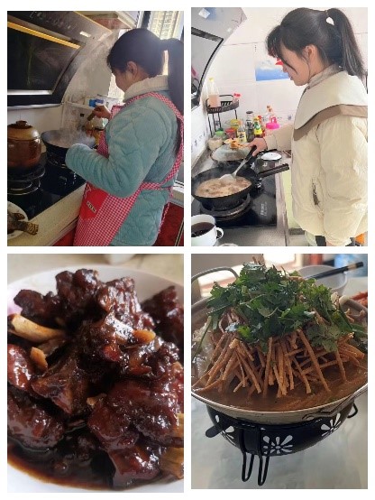 准备一次年夜饭,敬老孝亲正当时。年夜饭,又称“团圆饭”,体现了中华民族家庭成员的互敬互爱。一份糖醋鲤鱼,是年年有余的祝祷;一碟四喜圆子,是福禄寿喜的心愿;一盘红烧排骨,是节节登高的期盼。“人间烟火气,最抚凡人心”。2022级员工积极参与到做年夜饭的家庭劳动之中,唤醒内心的仪式感、认同感、使命感,感受年夜饭背后的家庭愿望与文化传承。