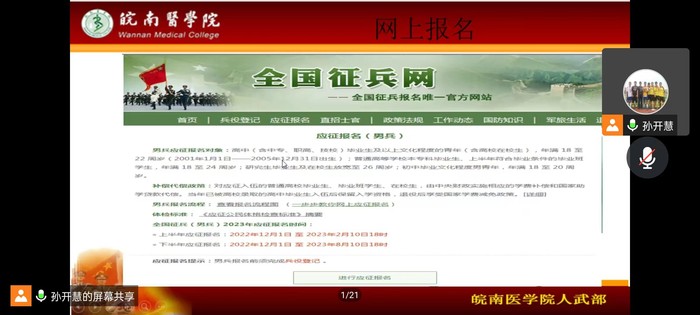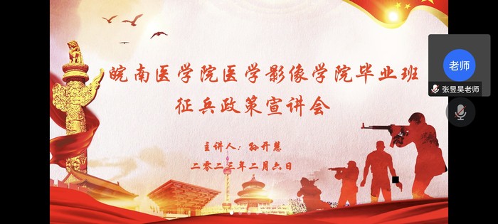 为扎实做好2023年度毕业生征兵工作,扩宽毕业生就业渠道,beet365于2月6日晚利用腾讯会议在线上召开了2023届毕业生征兵宣传工作。本次活动由毕业班辅导员主持,会议邀请了原员工处国防教育科科长孙开慧老师作征兵主题宣讲,2018级医学影像学、2019级生物医学工程、医学影像技术三个专业近300名毕业生参与会议。