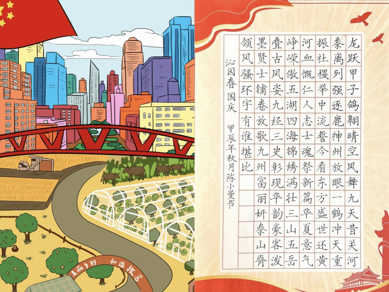 同学们运用笔墨,在一张一弛、一抑一扬之间,彩墨丝丝浸染着纸张,展现了祖国盛世景象的发展变化;字形盈盈展现着入木三分的志气,爱国之情就在其中流淌。