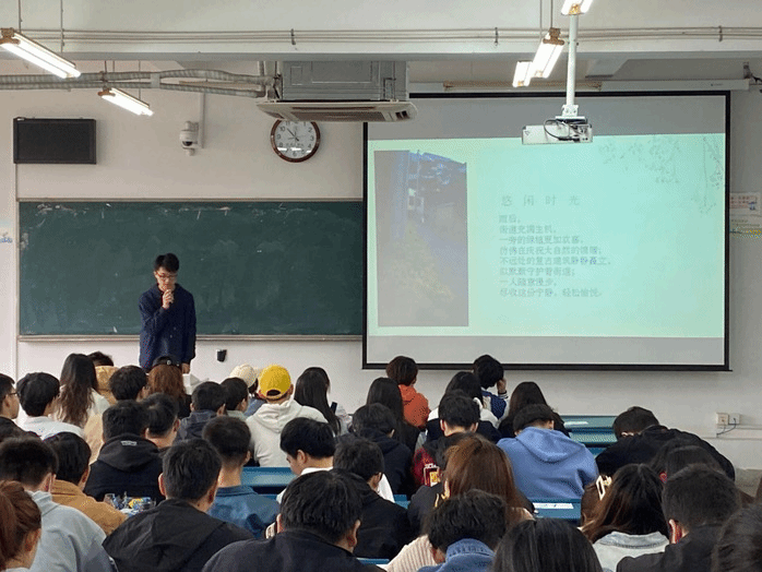 线下决赛于3月27日在1202教室正式开始,本次线下大赛将通过评委打分、观众投票,并结合网络票选最终评选出获奖作品。上午9点,在主持人的引导下,比赛正式开始。同学们依次上台以幻灯片与演讲结合的形式介绍自己的作品,讲述自己的生活。选手们紧扣大赛主题,展现出一张张精彩纷呈的作品,给予了观众及评委一场视觉盛宴。选手们绘声绘色的演讲,精致好看的幻灯片赢得场下观众如雷般的掌声,现场气氛到达高潮。