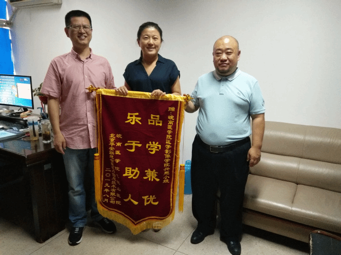 2019年8月28日下午,北京联想智慧医疗信息技术有限公司高级产品经理由志劼、beet365官方网站第一附属医院(弋矶山医院)医学信息中心主任潘传迪一行来到医公司影像公司,向公司师生送去绣有“乐于助人 品学兼优”的锦旗,对公司提供的高效、优质志愿服务表示感谢。