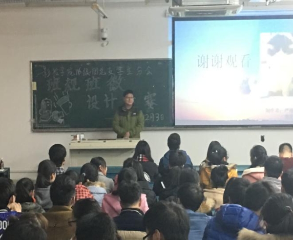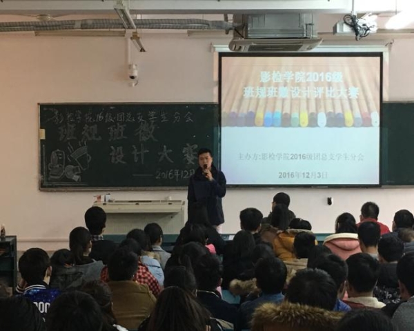 首先,由2016级团总支书记周超老师上台致词。他形象概括了这次比赛的主旨意义,告诫同学们要在班规班训的引领之下,激发学习动力,提高个人涵养,为不断创新打下坚实基础。