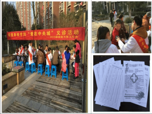 义务义诊传真情,传播社会正能量。义诊现场,同学们运用所学知识和仪器在各自的岗位上帮助居民测血压、量身高以及进行色觉和口腔测试。同学们用微笑热心服务着每一位前来体检的群众,用细致严谨的态度为每位前来体检的群众做着健康检查,用乐于奉献的心温暖着每个人。同学们热情周到的服务赢得了大家的一致好评和广泛赞誉。