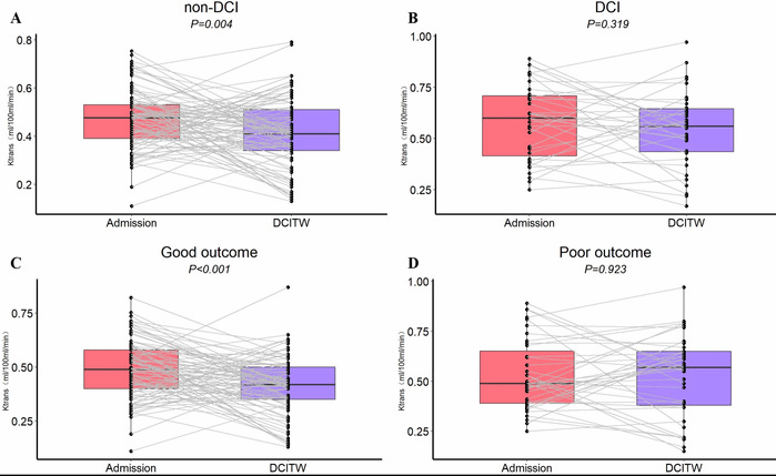 在非迟发性脑缺血(A)和预后良好组(C),血脑屏障渗透性从入院至迟发性脑缺血时间窗内显著下降;而在迟发性脑缺血组(B)与预后不良组(D),血脑屏障渗透性未见下降。