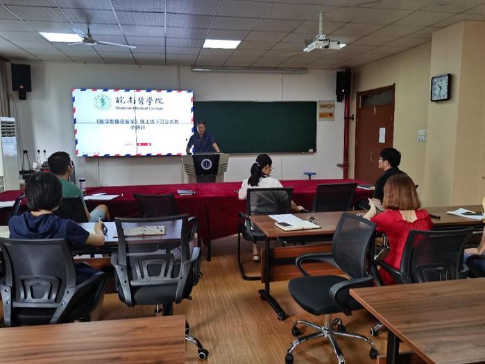 医学工程学教研室主任黄磊就《医学影像设备学》线上线下混合式教学展开研讨,围绕线上、线下混合式教学,线上、线下混合式课程的具体实施,以及省级质量工程项目申报等方面做了经验交流与分享,与会人员纷纷表示受益良多,从而为今后线上、线下混合式课程项目申报增强了经验和知识储备。