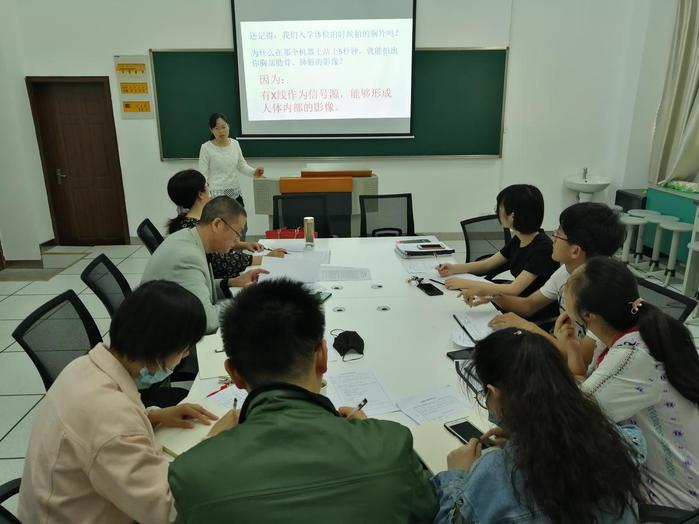 首先由教研室内高春芳老师就《医学影像设备学》课程中的第二章X线发生装置进行了备课,课程中她结合了当前疫情期间,新冠肺炎的临床表现和影像学表现作为新课引入,体现了专业课程中的思政融合。她鼓励大家学好专业知识,成长为心系社会并有时代担当的医学专业人才,为社会贡献自己的力量。