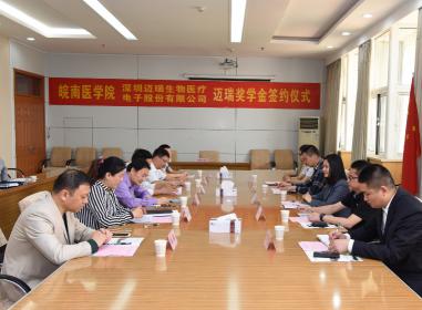 迈瑞公司安徽总经理卜瑞简要介绍了公司近年来在全球的发展情况,并表达了“校企合作服务社会”的美好夙愿,希望beet365官方网站“迈瑞奖学金”的设立能够对皖医学子的学习和成长起到良好的促进作用,并期望能够与皖医建立更为深入的产学研合作关系。