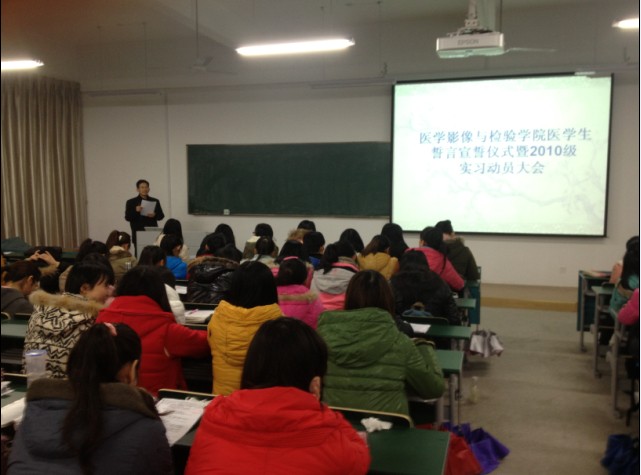 2013年12月17日下午, 医学影像与检验公司2010级医学影像学专业医员工誓言宣誓仪式暨实习动员大会在逸夫楼顺利召开。公司领导和全体教师、辅导员老师以及2010级医学影像学专业全体实习生参加了会议。会议由2010级辅导员魏巍主持。