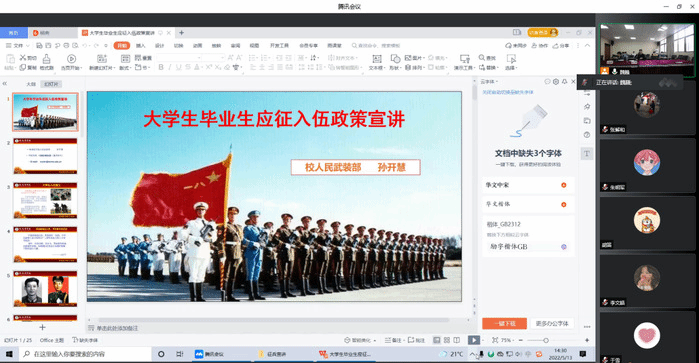 5月13日,公司开展就业政策进课堂,邀请员工处国防教育科科长孙开慧老师做“老员工毕业生应征入伍政策宣讲”,2022届、2023届毕业生线上线下参加宣讲。孙开慧结合自身和往届应征入伍同学的经历,以积极应征入伍是每一位男性公民应尽的义务开始,从老员工入伍意义、在部队发展的路径、退役安置政策、芜湖市镜湖区入伍政策等几个方面,详细宣讲了老员工应征入伍的相关程序和政策,鼓励老员工毕业生投身军营,报效祖国。13日下午,公司党委书记王爱侠就毕业就业中的几个问题与2022届、2023届毕业生进行了线上交流,王爱侠从当前毕业生规模、近十年考研及录取情况、公司2017届-2021届毕业生的就业情况等方面,为毕业生分析了当前就业形势、就业途径、相关就业政策,提醒同学们要根据自身实际情况合理规划就业目标,恰当择业、满意就业;随后,她就国家和地方基层就业项目及相关招募政策进行了详细的讲解,鼓励毕业生们到西部去、到基层去、到部队去、到祖国需要的地方去,要有“只要祖国需要,我愿意”的思想境界和行动自觉。