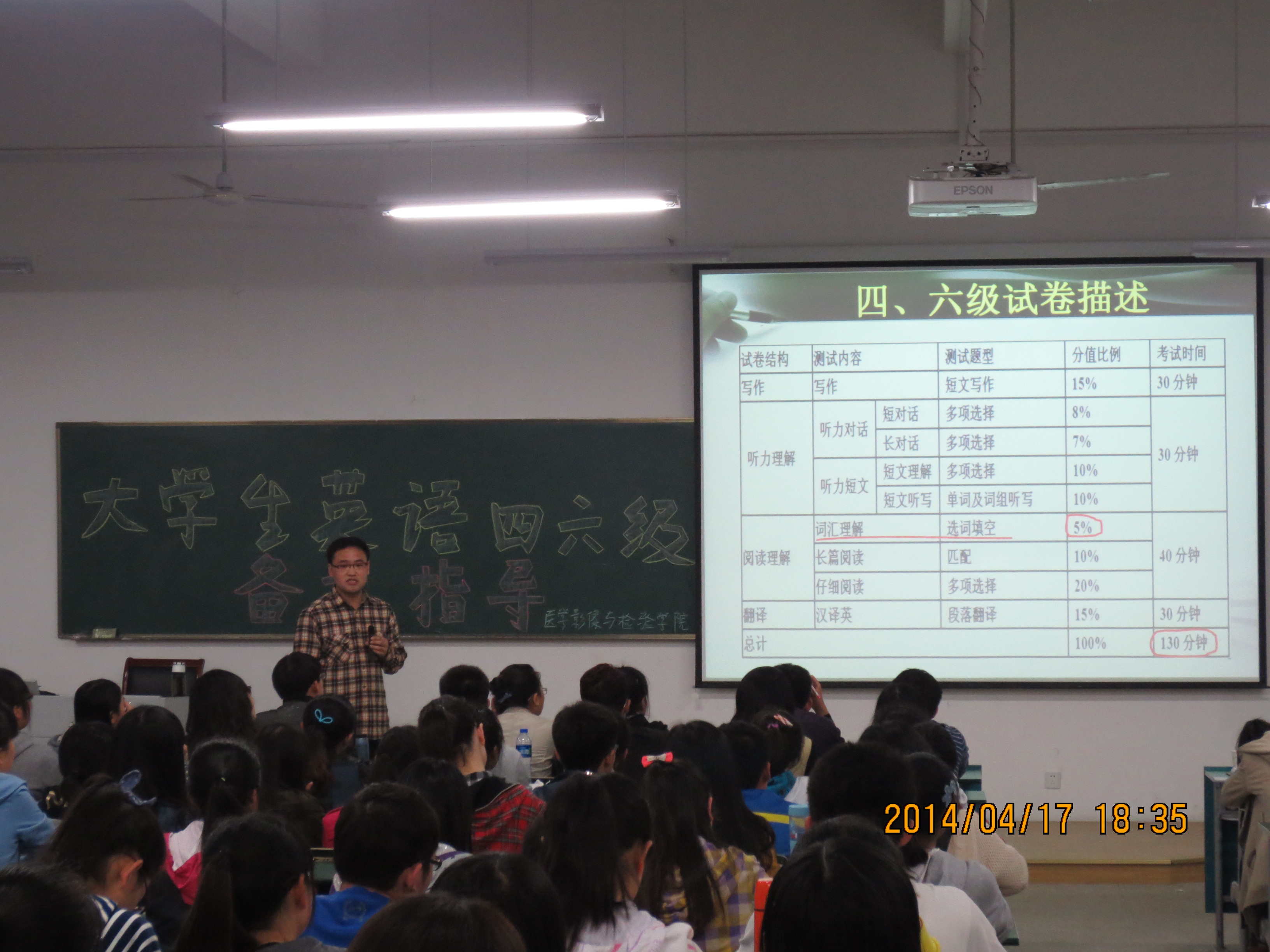 为帮助公司学子备考英语四、六级,提高实战能力和应试技巧,2014年4月17日,医学影像与检验公司在逸夫楼101教室举办英语四、六级备考指导讲座。公司外语教研室康勇老师应邀担任主讲。讲座由公司团委副书记陶香林老师主持。