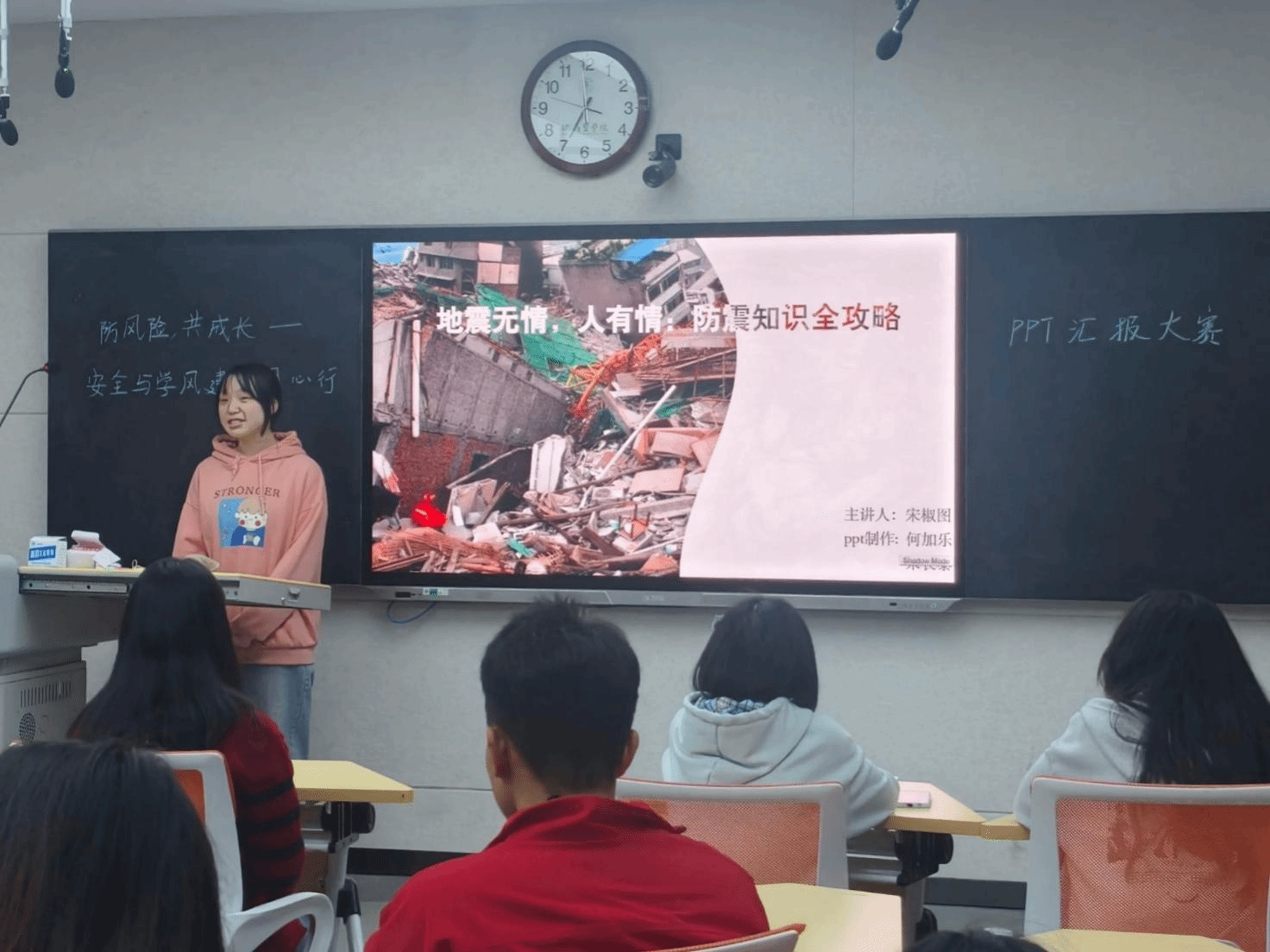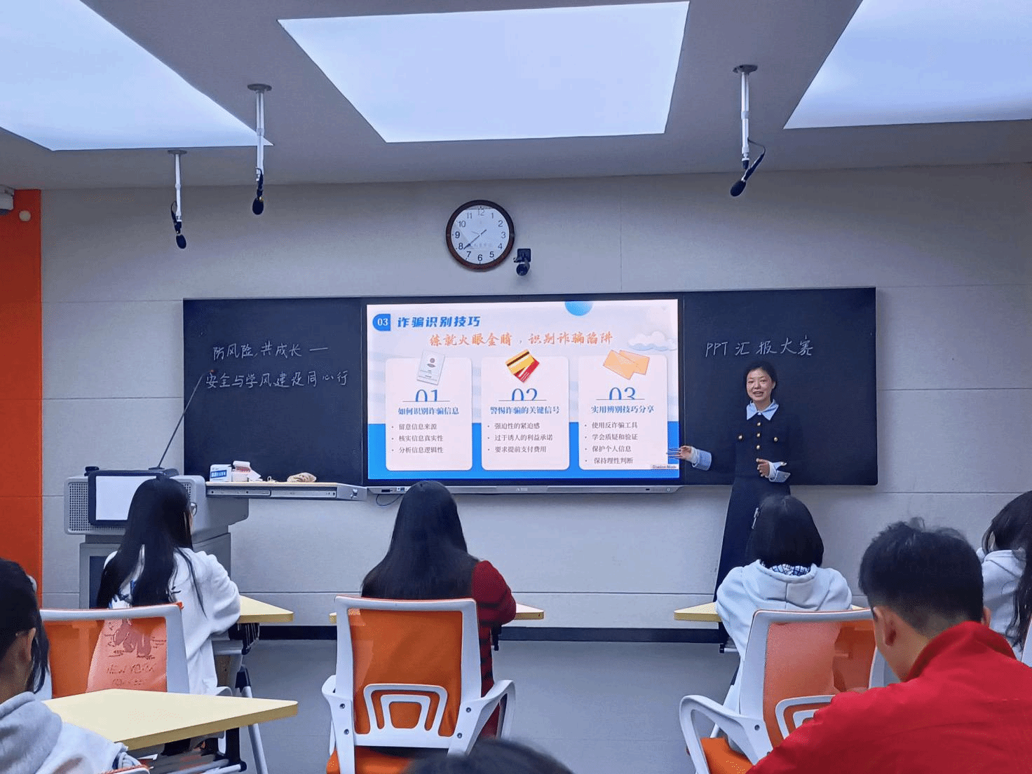 比赛准备阶段,参赛选手认真查找相关资料、整理分析案例、归纳总结,制作与主题相关的PPT。比赛开始前,公司团委书记张昱昊带领员工共同观看了《消防公开课 安全我来说》校园篇和电动自行车篇两个视频。比赛过程中,影像2306班宋椒图同学借助精心设计的PPT,通过图文展示了地震灾害给我们日常生活带来的毁灭性影响,通过她细致入微地讲解地震发生时的有效防灾减灾措施,极大地提升了在场师生对地震危害的认知及地震来临时防灾减灾的能力。影像2306班宋雨晨同学深度剖析了防范诈骗的重要意义,通过展示电信网络诈骗、投资理财诈骗等多个真实的案例,让在场师生深刻认识到诈骗行为的危害,汇报总结部分,她进一步强调了防范措施的重要性,特别提醒师生们切勿随意点击陌生链接,遇到任何可疑情况都应立即与警方或相关机构进行核实,以确保个人财产安全不受侵害。