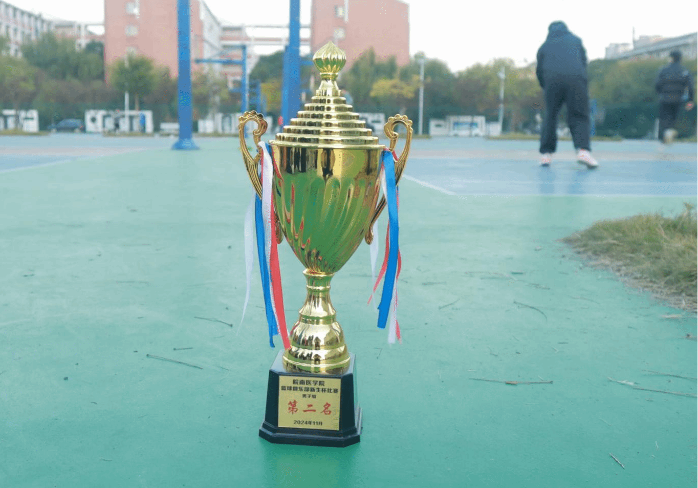 在阳光下,每一个飞驰的身影尽显青春活力之绚烂;每一滴滑落的汗珠,都闪烁着内心坚韧与执着的光芒。赛场上,球员们精神饱满,斗志昂扬,他们熟练运球,默契传球,精准投球,一幕幕精彩瞬间在球场上接连上演。篮球框下,你争我夺,你攻我守,比赛场面紧张激烈,扣人心弦,一次次精彩的扣篮将比赛气氛推向高潮,赢得了现场观众阵阵热烈的欢呼声。与此同时,赛场边的啦啦队也全力以赴,声嘶力竭地呐喊着,用响亮的口号为球场上的运动员们注入源源不断的动力,赋予他们无尽的勇气与力量。球员们全身心投入,顽强拼搏,最终取得了“新生杯”篮球赛男子组第二名的优异成绩。
