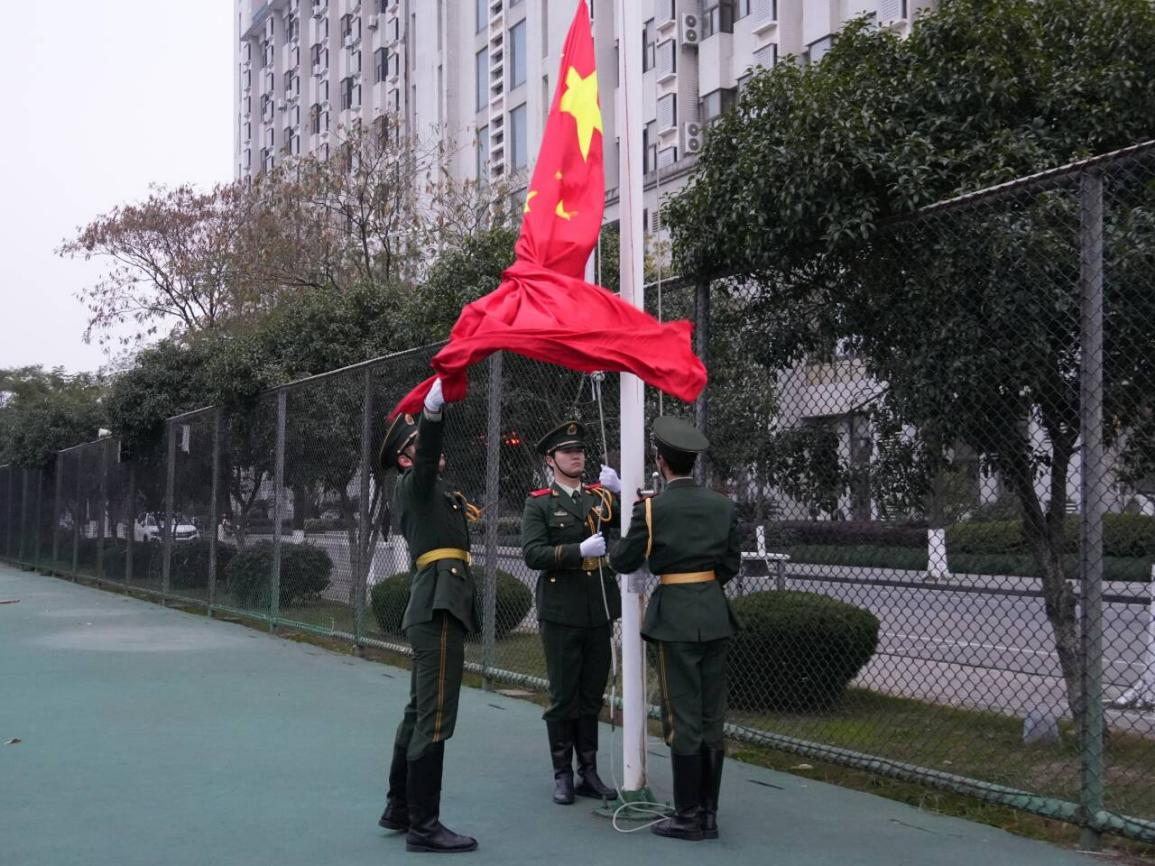7点10分,活动准时开始,师生齐聚操场,共同参与这场意义非凡的升旗仪式。随着国旗护卫队庄严入场,师生们的目光都聚焦在了缓缓升起的五星红旗上。全体师生齐声高唱国歌,每个人的眼中都闪烁着信仰的光芒,每个人的心中都充满了对祖国的热爱和敬意。