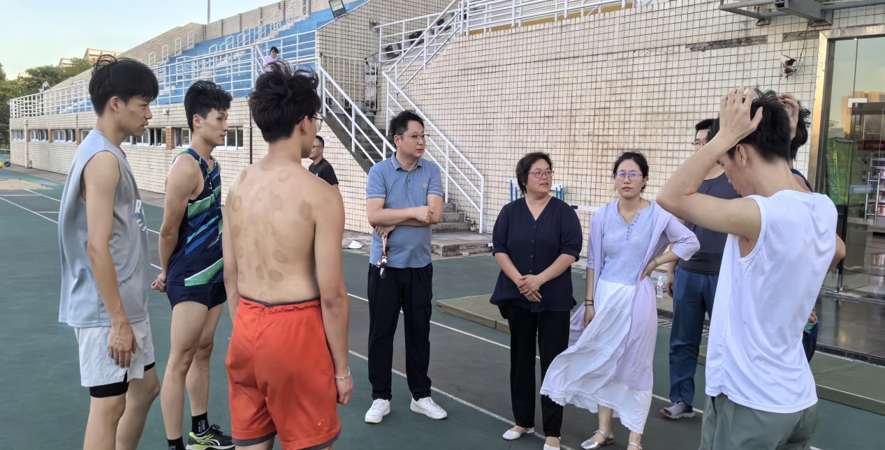 在运动场上,老师们关注留校员工的体育训练状况,叮嘱大家运动时要做好热身,避免受伤,夏季高温时段注意防暑降温,运动后及时补充水分,保持身体状态,勉励他们科学训练、合理安排休息时间,为公司后续争得荣誉。
