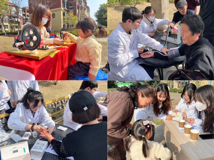 义诊现场,志愿队队员为社区居民进行健康知识普及和身体检查,将健康服务送到群众身边。志愿者为老人测量血压、血糖,为小朋友测量身高、体重,并给他们做嗅觉和色盲的检查等,耐心与每一位到来的社区居民沟通讲解,同时发放健康饮食管理和主义事项的手册,并在诊断结束后给老人发放药品和口罩,嘱咐他们日常健康饮食,合理锻炼。