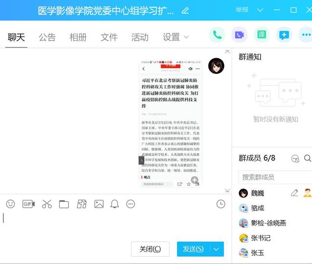 此次学习通过学习强国视频会议和QQ群讨论相结合的方式进行学习,通过工作群进行学习交流。大家学习了习近平总书记在统筹推进新冠肺炎疫情防控和经济社会发展工作部署会议上的讲话;习近平总书记的重要文章《全面提高依法防控依法治理能力,健全国家公共卫生应急管理体系》;习近平总书记在北京考察新冠肺炎防控科研攻关工作时的重要讲话—为打赢疫情防控阻击战提供科技支撑和习近平总书记给在首钢医院实习的西藏大学医公司员工的回信精神等。
