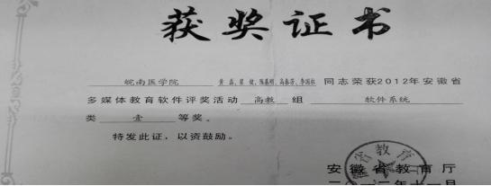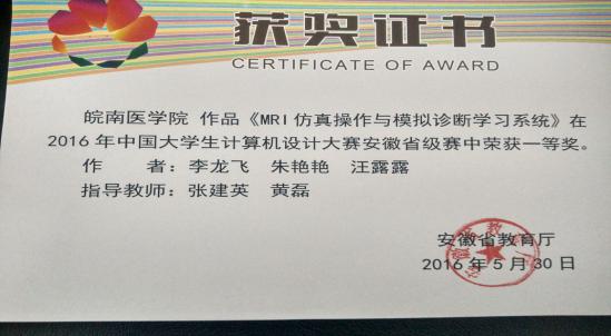 在繁琐的日常教学和教学管理工作,黄磊不忘总结经验,积极参与专业教学改革。先后主持2012年度省教育厅一般教学研究项目(编号:2012jyxm323)和第1参与者参与2013年度安徽省高等教育振兴计项目(编号:2013zytz040):生物医学工程专业改造与新专业建设,并发表多篇教学论文。十几年来黄磊从未间断自身学习,多次利用寒暑假参加实践学习和教学,先后两次申报国内访问学者,不断提高专业水平。2012年在“安徽省多媒体教育软件”评奖活动中获得高教组软件系统一等奖,指导员工自主研发的“CT仿真操作与诊断虚拟实验系统”获得2014“合财”杯中国计算机设计大赛计算机设计大类虚拟实验平台小类全国二等奖,“MRI仿真操作与模拟诊断辅助学习系统”获2016“合财”杯中国计算机设计大赛计算机设计大类虚拟实验平台小类安徽赛区一等奖等。